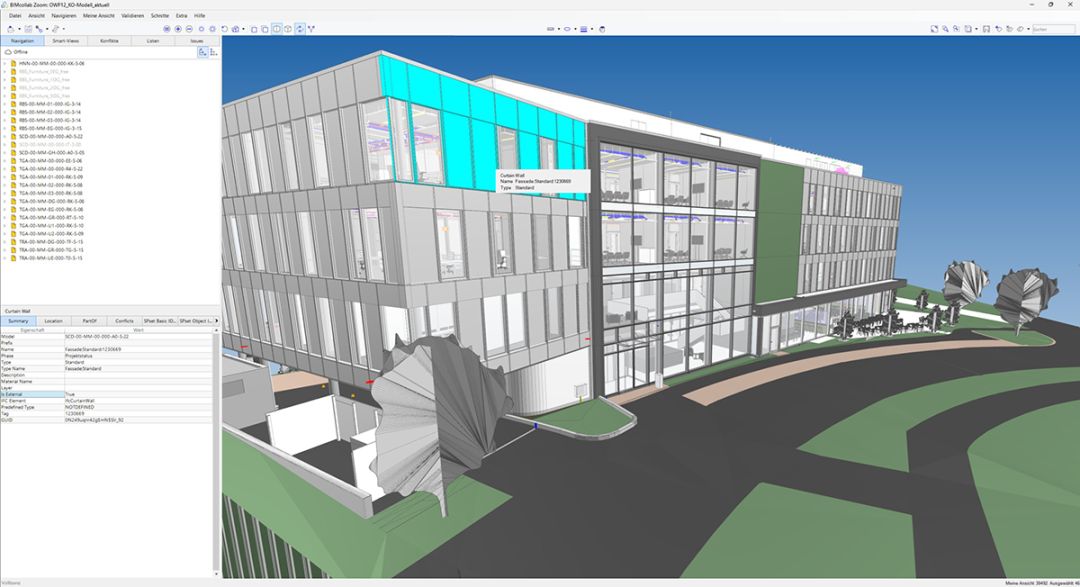 Marcel Özer: Es gibt die passenden Schnittstellen zu den entsprechenden Anbietern, Berechnungen und Systemen. Zu Madaster beispielsweise, das den Materialwert im ausgeführten Gebäude für künftiges Recycling beziffert, oder zur Deutschen Gesellschaft für nachhaltiges Bauen, DGNB, deren Zertifikate unter anderem die ökologische Nachhaltigkeit von Gebäude bewerten. Die BIM-Methodik hat uns erheblich bei der Nachweisführung unterstützt, indem wir den Datenfluss mit der DGNB optimieren konnten.